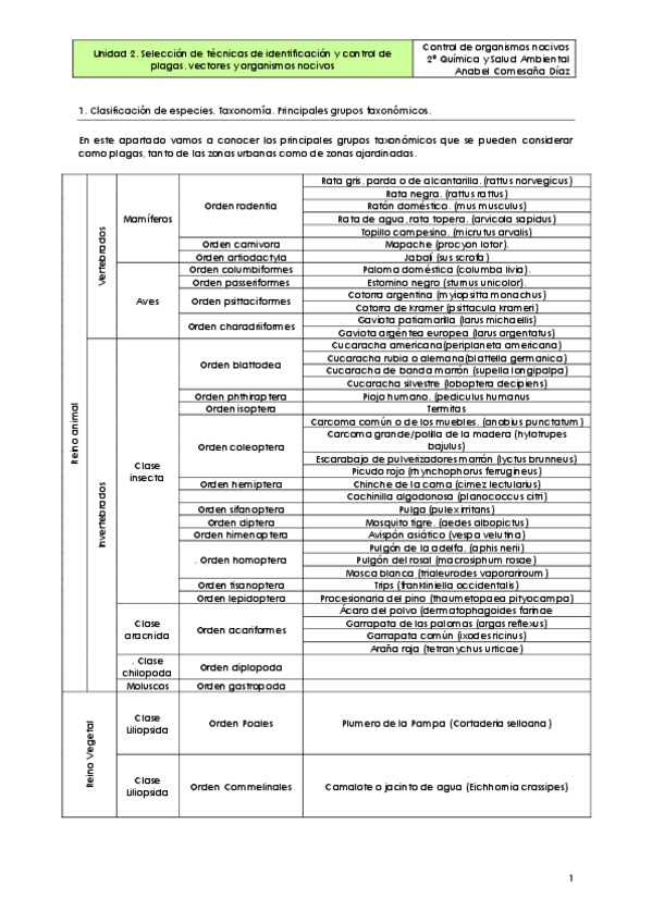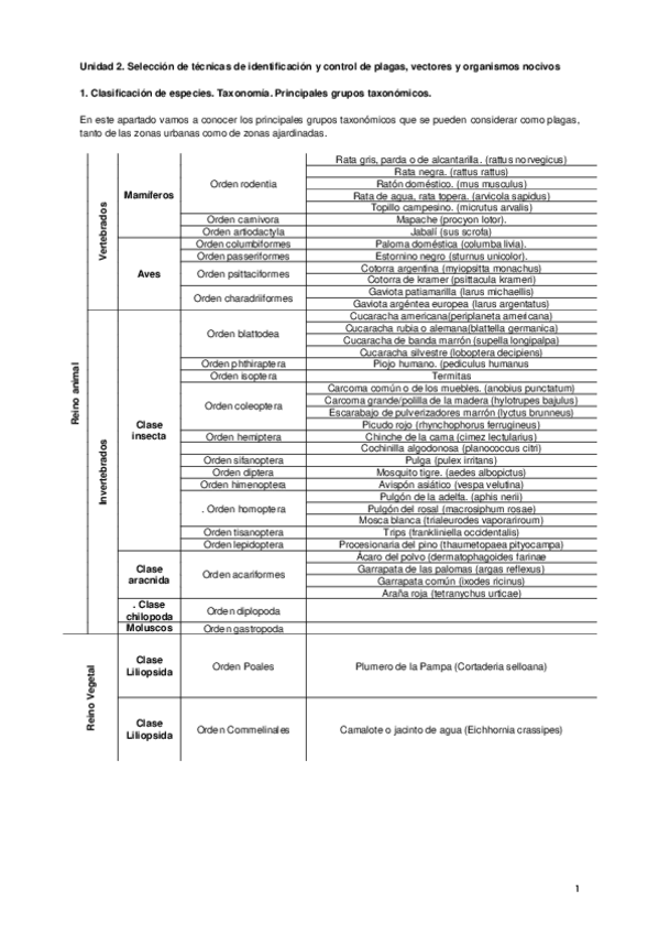 SELECCIÓN DE TÉCNICAS DE IDENTIFICACIÓN Y CONTROL DE PLAGAS VECTORES Y ORGANISMOS NOCIVOS Clasificación de especies
