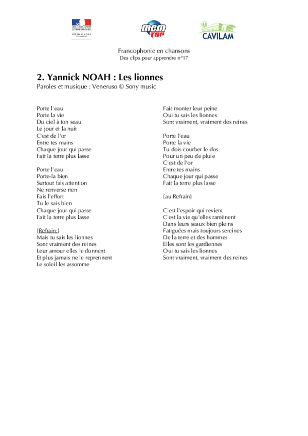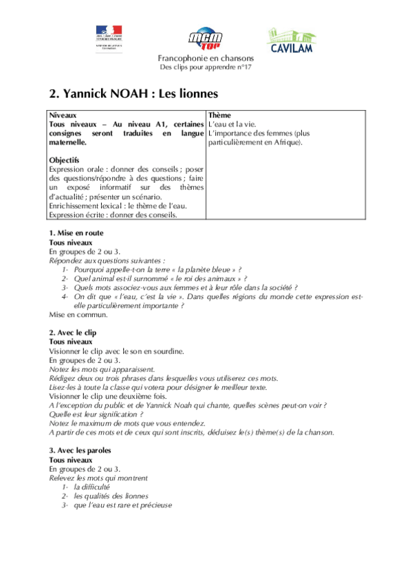 He publicado nuevos apuntes de 1º Lengua Extranjera: Chanson-A2-Yannick-Noah-Les-lionnes.pdf