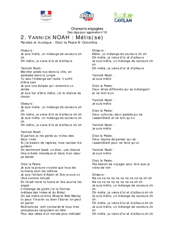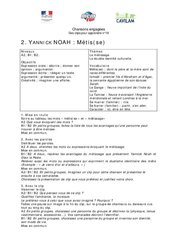 He publicado nuevos apuntes de 1º Lengua Extranjera: Chanson-A2-Yannick-Noah-Metisse.pdf