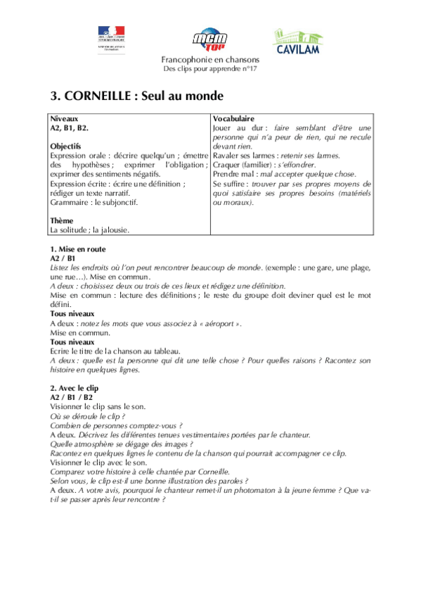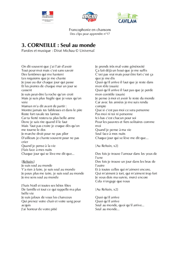 He publicado nuevos apuntes de 1º Lengua Extranjera: Chanson-B1-Corneille-Seul-au-monde.pdf