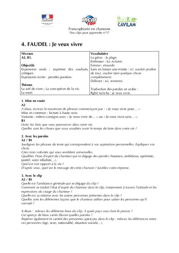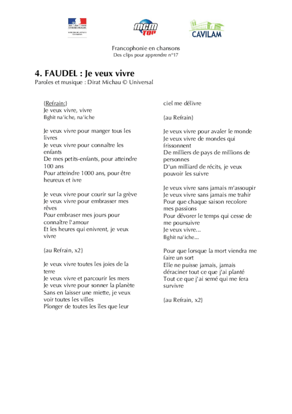 He publicado nuevos apuntes de 1º Lengua Extranjera: Chanson-B1-Faudel-Je-veux-vivre.pdf