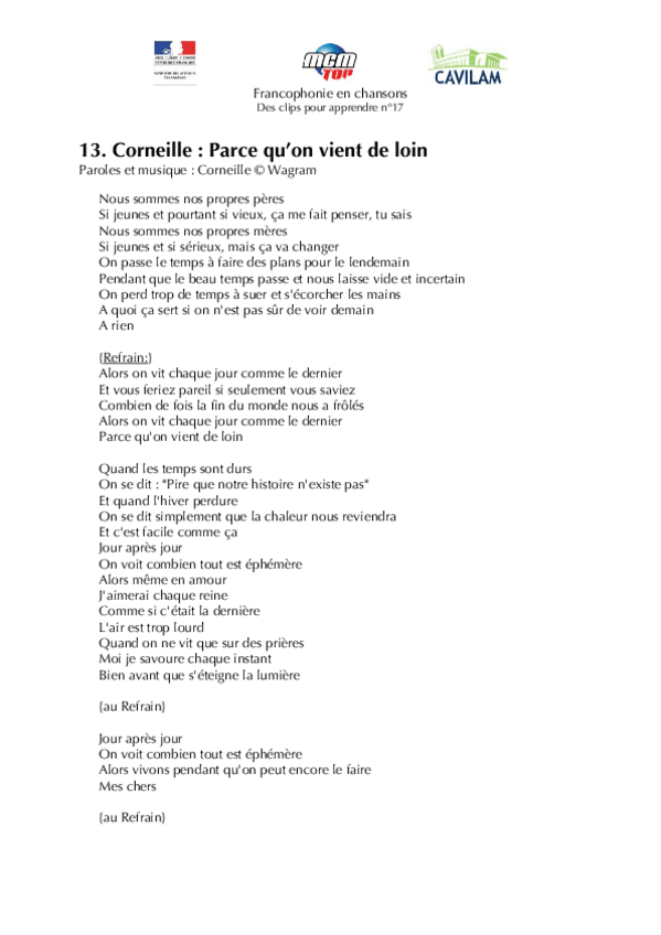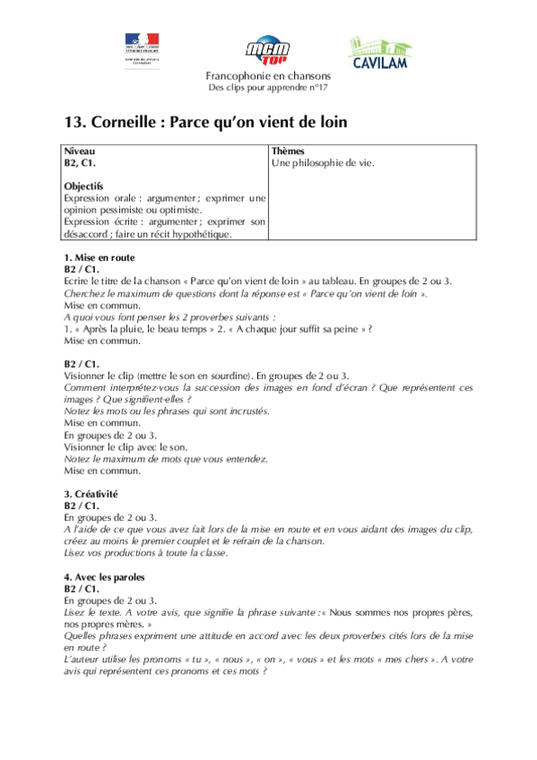 He publicado nuevos apuntes de 1º Lengua Extranjera: Chanson-B2-Corneille-Parce-quon-vient-de-loin.pdf