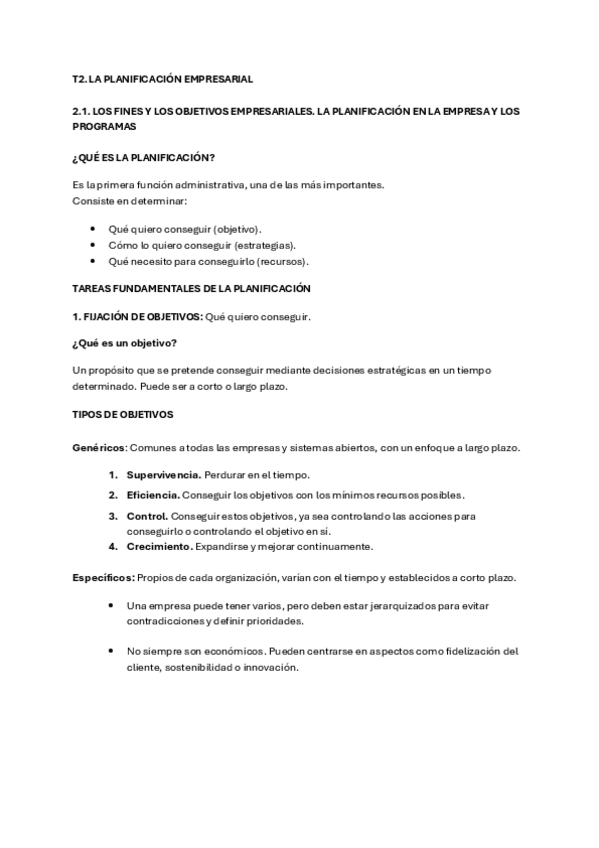 Apuntes de Tema 2: La planificación empresarial - Administración de la Empresa (2º cuatrimestre, 1º de ADE)