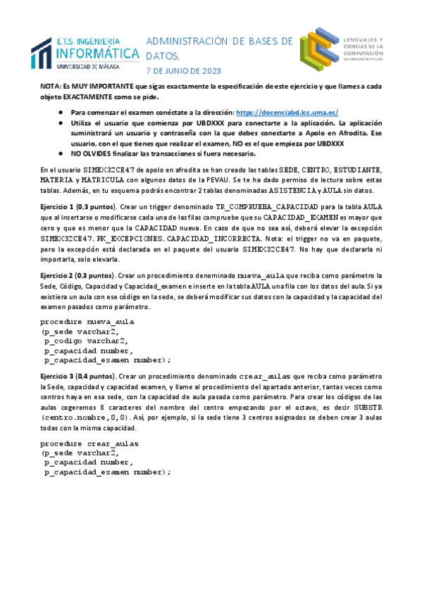 He publicado nuevos examenes de 3º Administración de Bases de Datos: Examen-PLSQL-y-Triggers-Julio-2023-2024.pdf