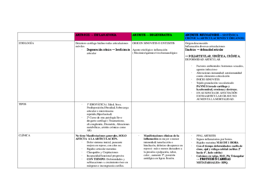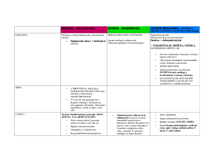 TABLAS RESUMEN TIPOS DE ARTRITIS