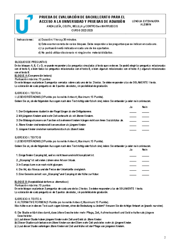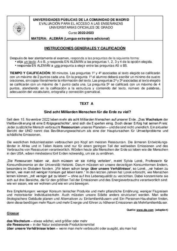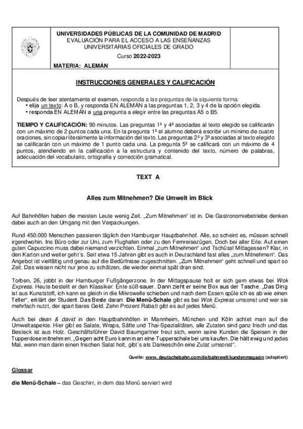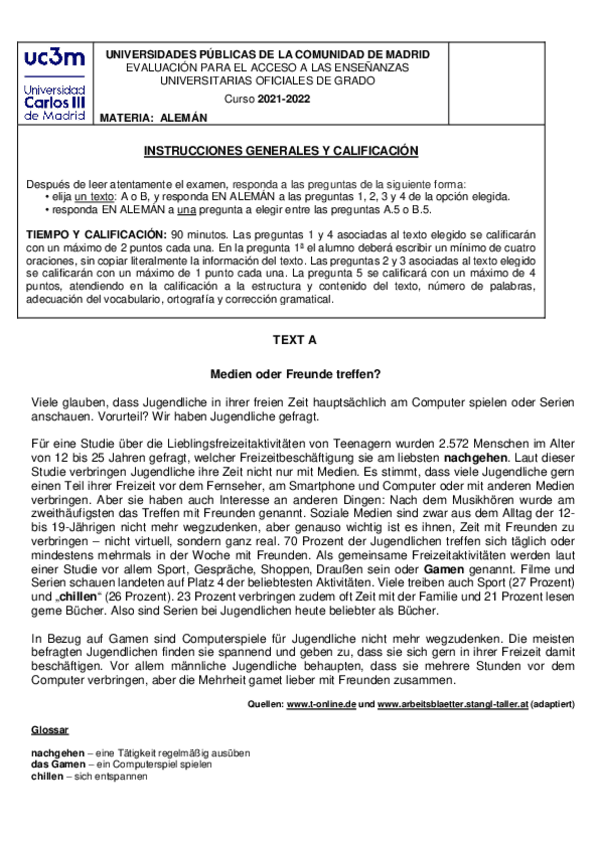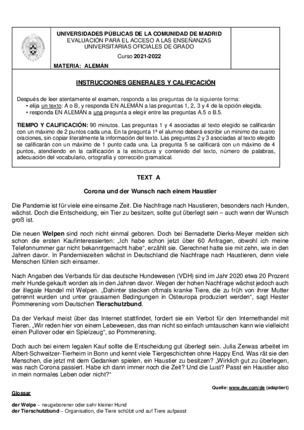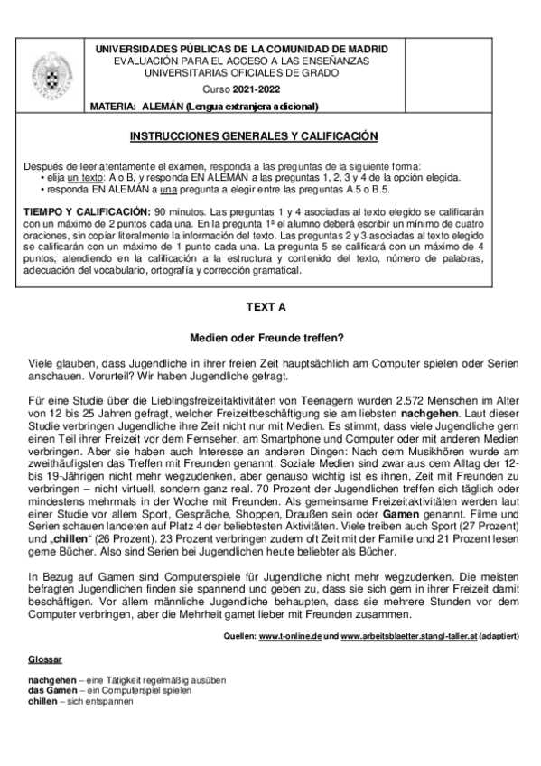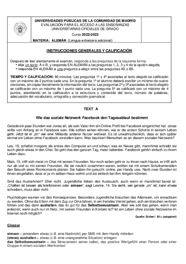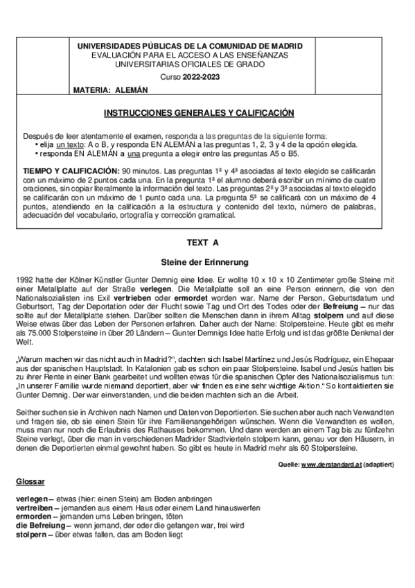 Exámenes Alemán EvAU Madrid 2022