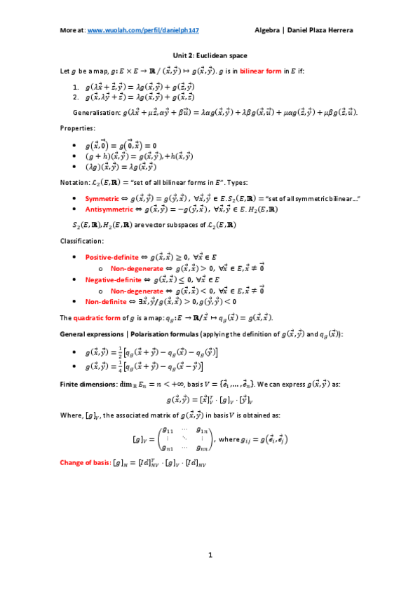 He publicado nuevos apuntes de 1º Algebra and geometry: Unit 2. Euclidean space.pdf