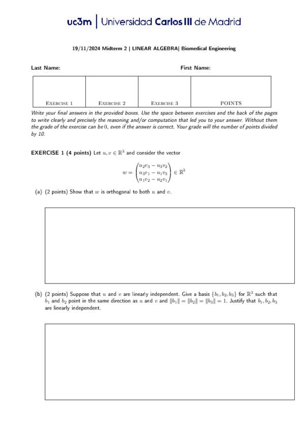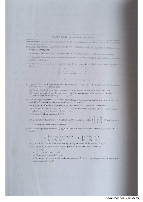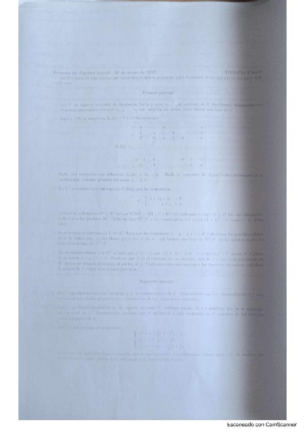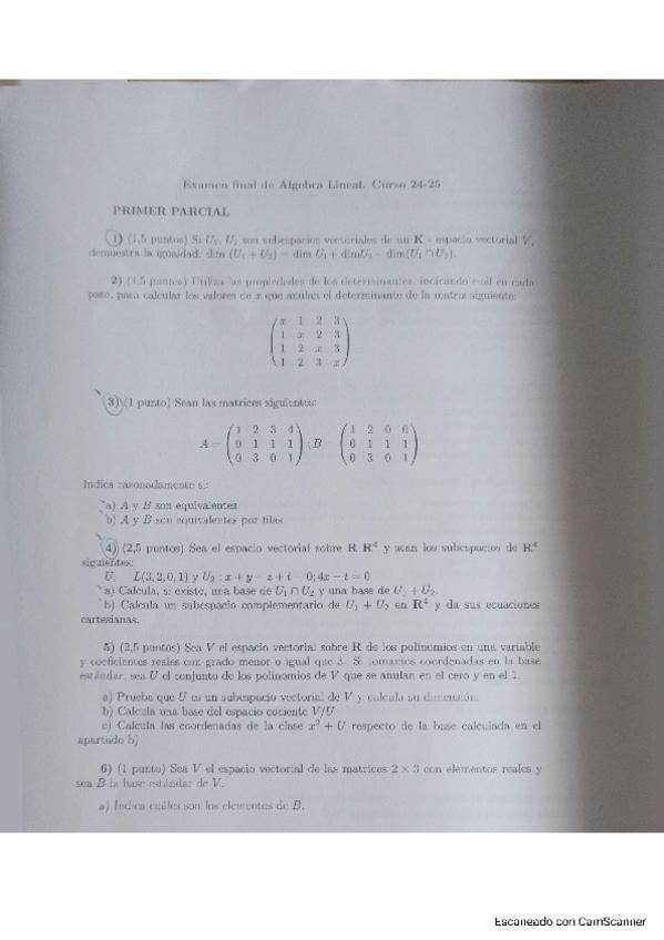 Primer Parcial de Algebra Lineal del tema 1 (espacios vectoriales) y del tema 2 (subespacios vectoriales)