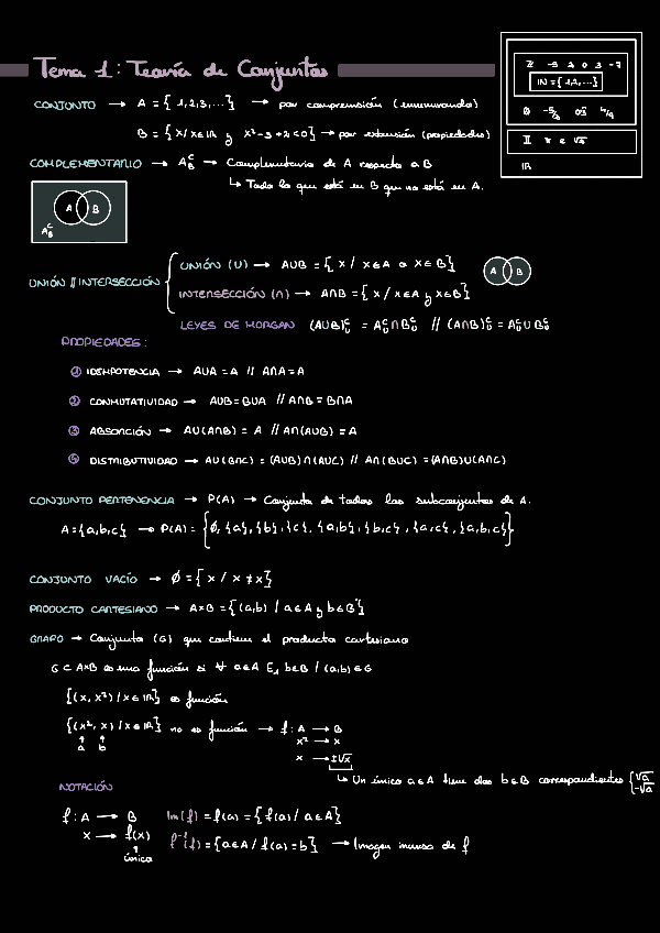Los conceptos fundamentales de cada tema. Hay una errata en Tema 1-Tipos de funciones-Inyectiva. Corrección: dim(A)<(o igual) dim(B)