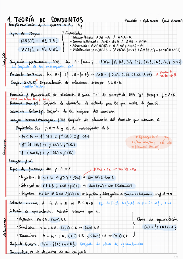Los conceptos fundamentales de cada tema. Hay una errata en Tema 1-Tipos de funciones-Inyectiva. Corrección: dim(A)<(o igual) dim(B)