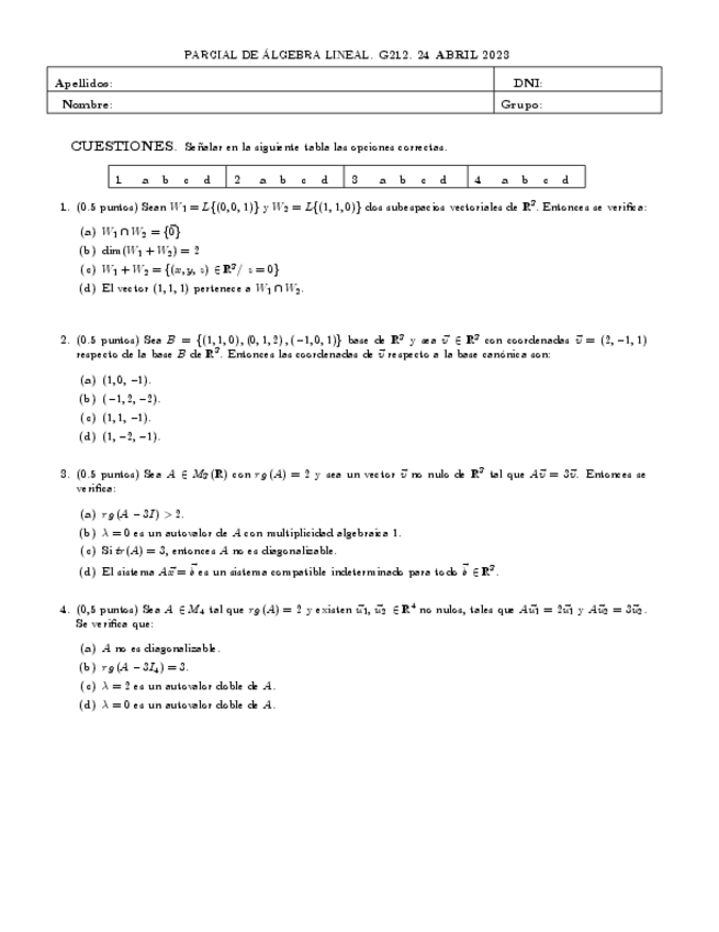 He publicado nuevos examenes de 1º Álgebra Lineal: Parcial 1 Algebra Temas 1-5.pdf