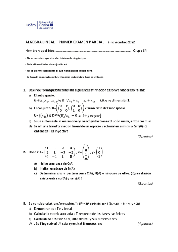 He publicado nuevos examenes de 1º Álgebra Lineal: 1º parcial 2022-23 con soluciones.pdf