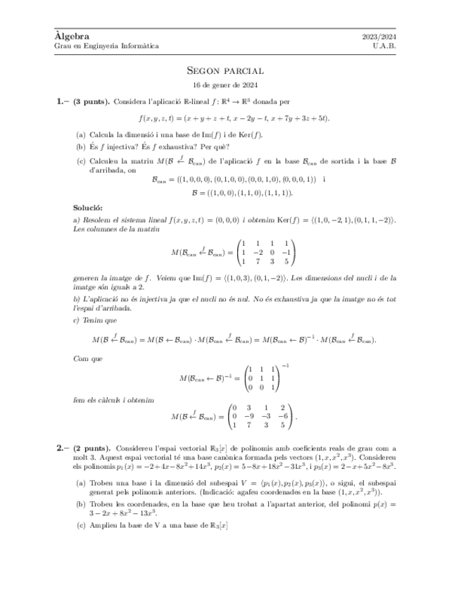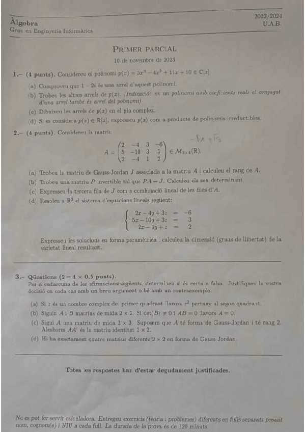Examen Recuperacio 2023 2024 2324 | Examen Recuperacion 2023 2024 2324 | Algebra