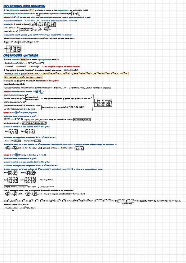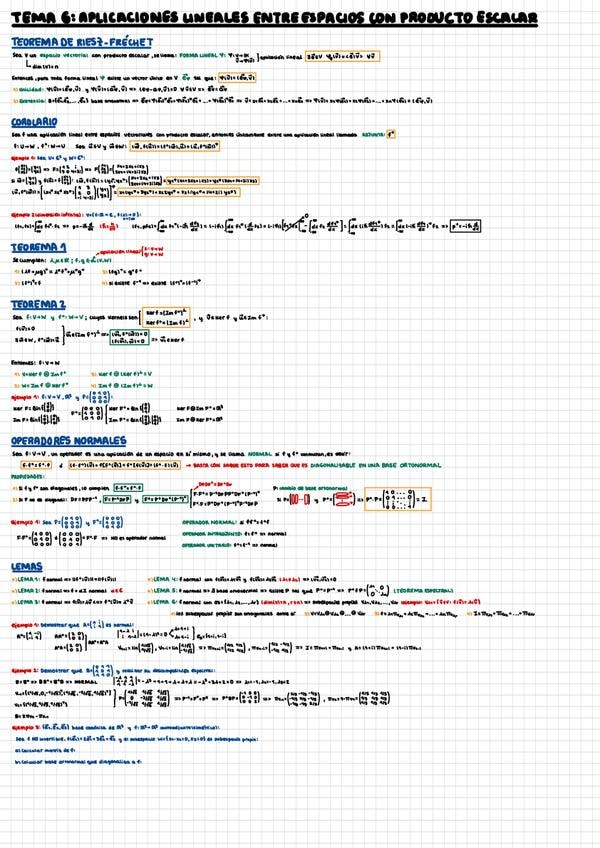 Resúmenes de casi todo álgebra: operadores normales, producto escalar, aplicaciones lineales entre espacios con producto escalar, valores y vectores propios, espacios vectoriales, etc.