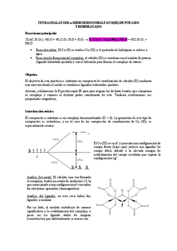 Informe de prácticas: TETRAOXALATODI-μ-HIDRÓXIDOCOBALTATO(iii) DE POTASIO TRIHIDRATADO