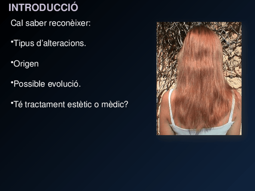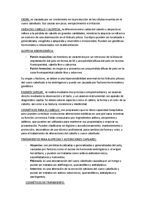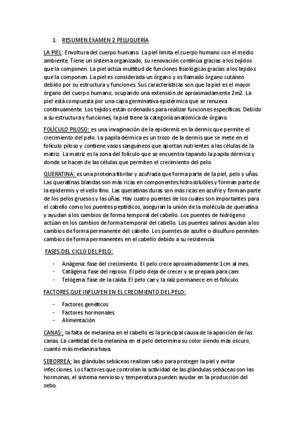 Es un resumen relacionado con la piel, análisis capilar, todo lo que tiene que ver en la peluquería, como la caspa, folículo piloso, queratina...