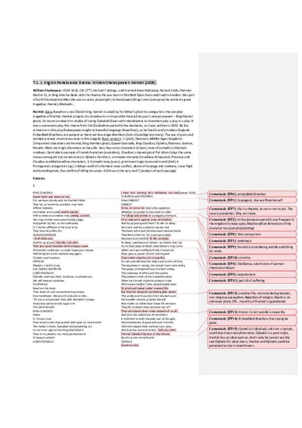 Apuntes de Análisis de textos II, desde Tema 1: 1. English Renaissance Drama. William Shakespeare's Hamlet, hasta Tema 9: 9. British Feminist Drama. Top Girls (1982) by Caryl Churchill