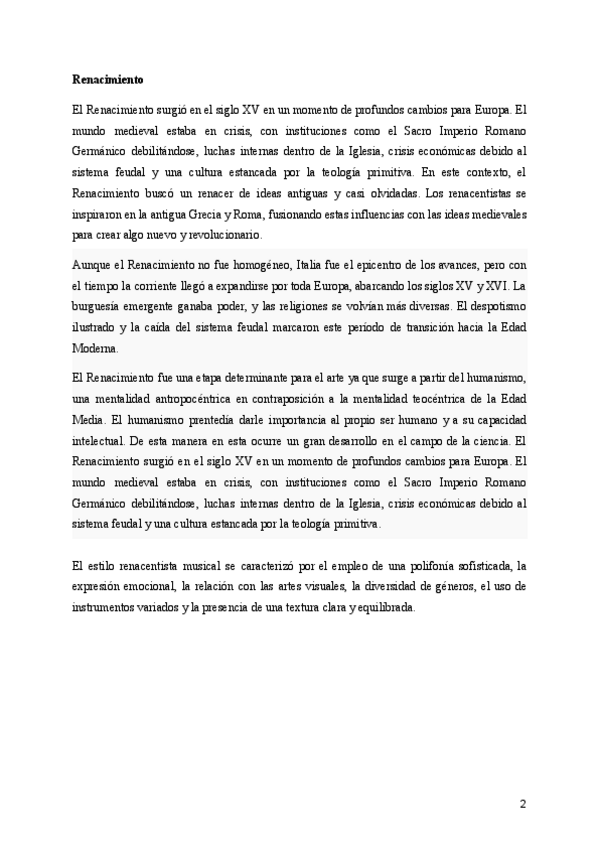 Contextos históricos y explicación del estilo desarrollado en las siguientes etapas: Edad Media, Renacimiento, Barroco, Romanticismo, Nacionalismo, Impresionismo y Música popular urbana.