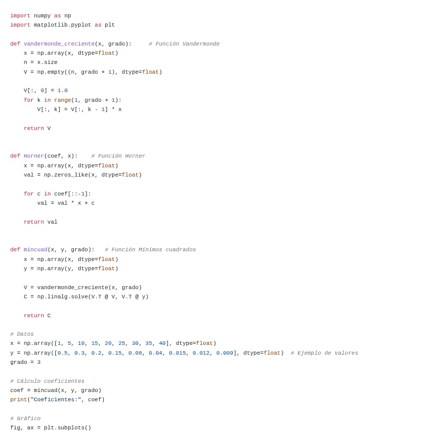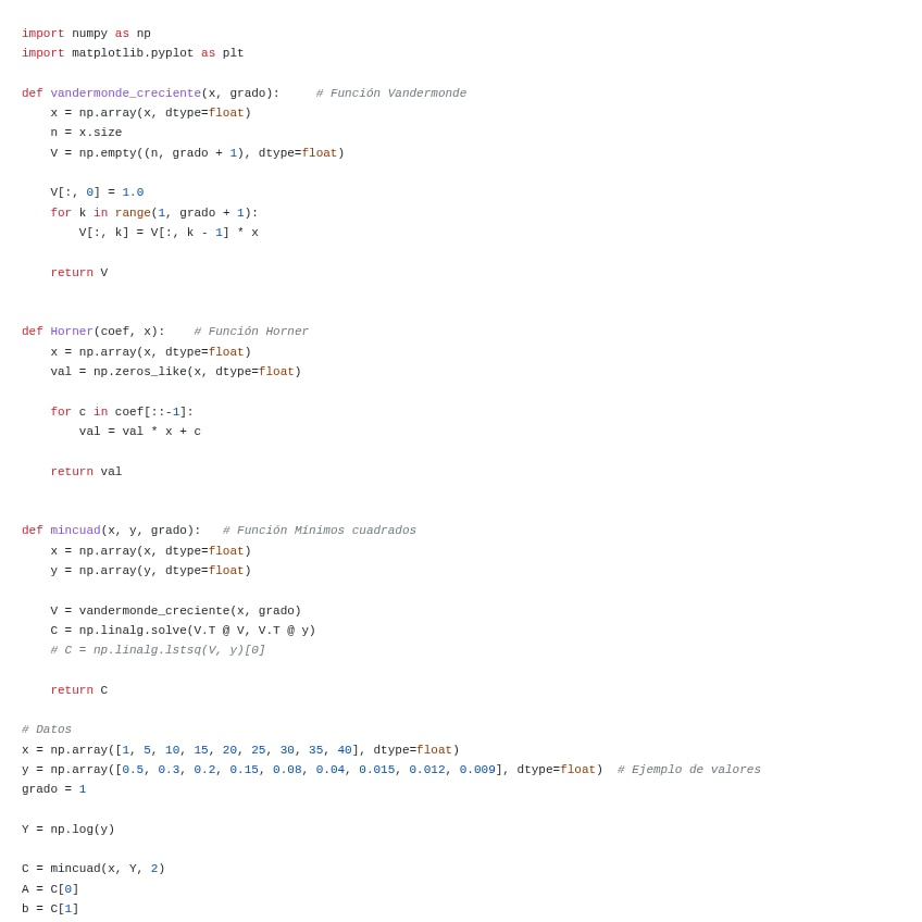 Se trata de dos archivos en lenguaje Python listos para implementar el método de mínimos cuadrados. En el primero se resuelve la aproximación mediante rectas y en el segundo mediante logaritmos.