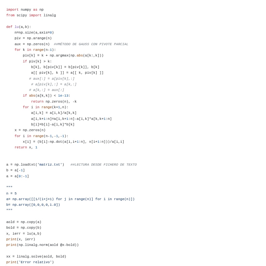 Se trata de un código en Python listo para implementar y resolver sistemas mediante el método de Gauss con pivote parcial.