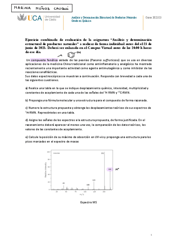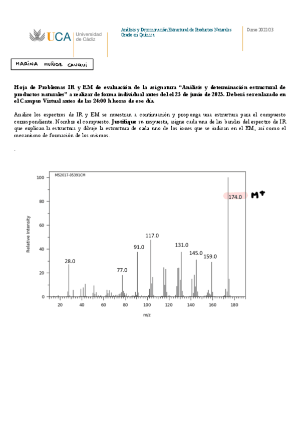He publicado nuevos trabajos de 3º Análisis y Determinación Estructural de Productos Naturales: Ejercicio-IR-MS-Nota10.pdf