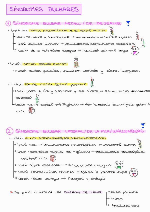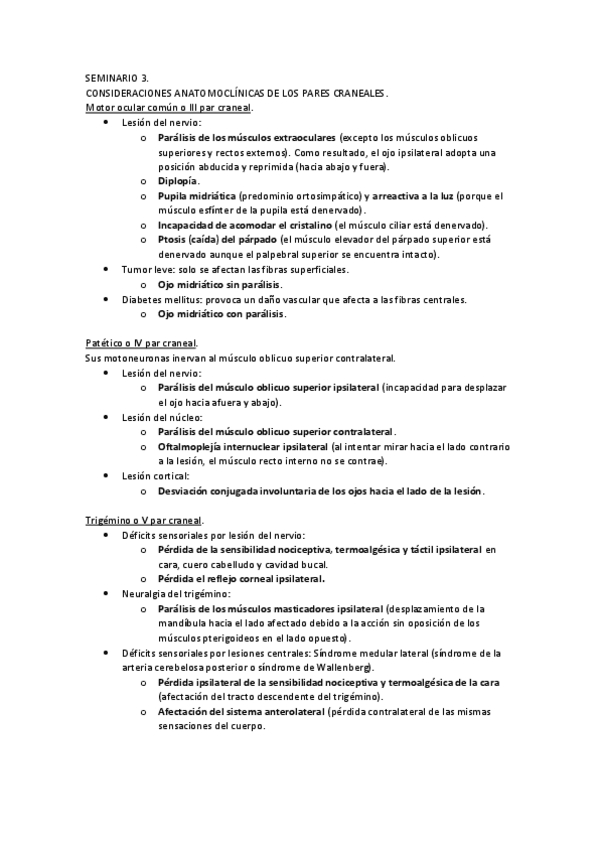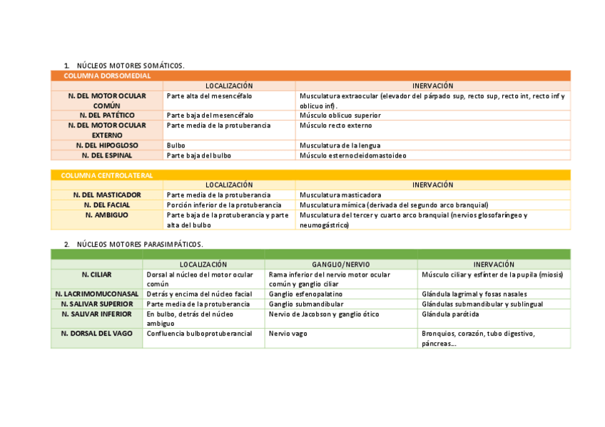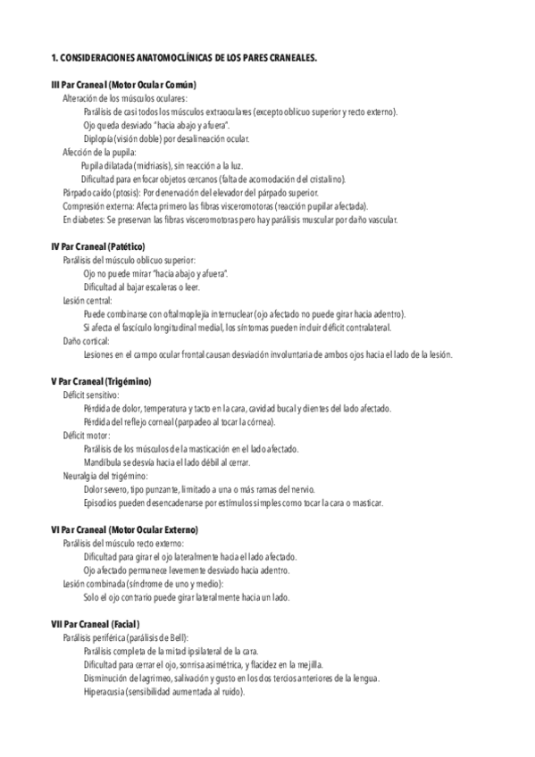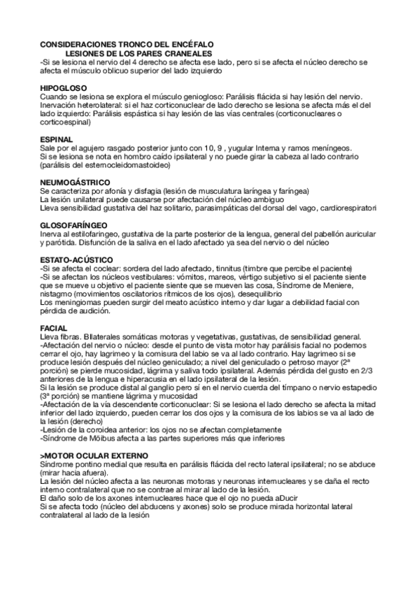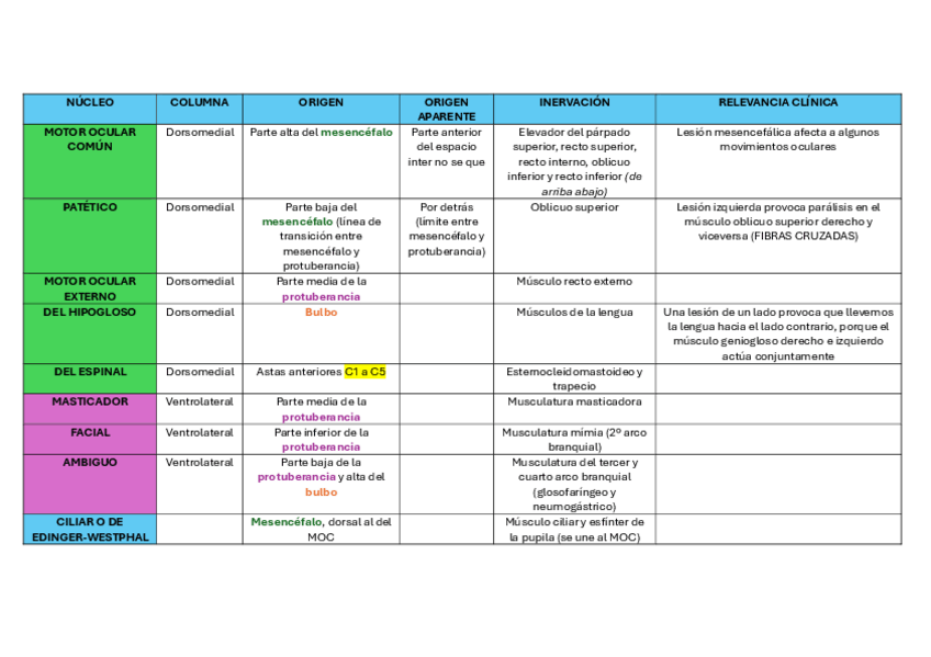 Para la clínica, en esta tabla recogí los síntomas de las lesiones de los pares y sus causas (irrigación, enfermedades o daños) )