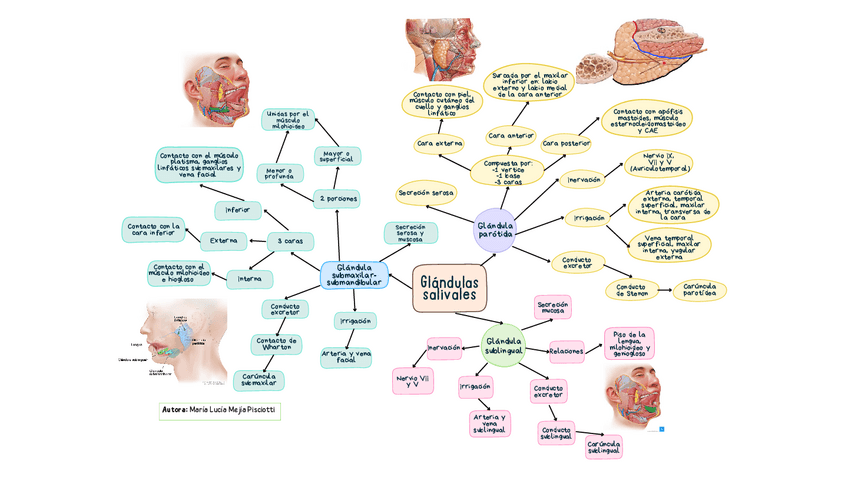 En este mapa mental podrás encontrar la anatomía de las glándulas salivales mayores: parótida, submaxilar y sublingual, así como su inervación, irrigación y relación anatómica.