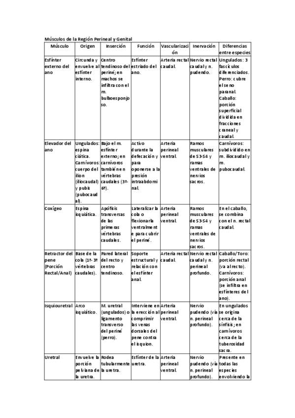 Para cada músculo se describe en la tabla: Origen, inserción, función, vascularización, inervación y diferencias entre especies