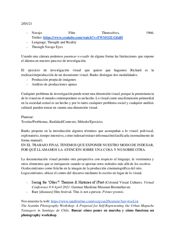 He publicado nuevos examenes de 3º Antropología visual: EXAMEN-VISUALES.-Exposito-Martin-Javier.-2020.-Antropologia-visual-Del-registro-etnografico-al-cine-compartido.-Boletin-del-Museo-Chileno-de-Arte-Precolombino-252-31-47.pdf