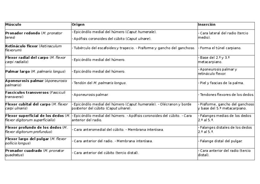 Tabla con inervaciones, origen e inserción y función de los músculos del miembro superior.