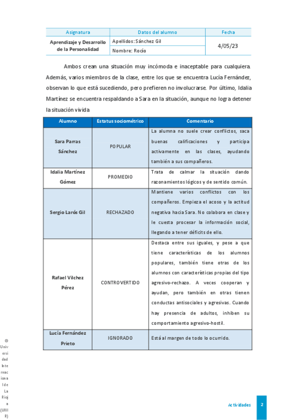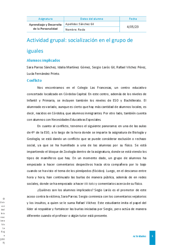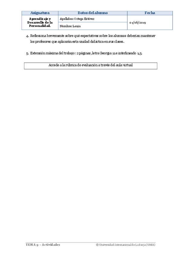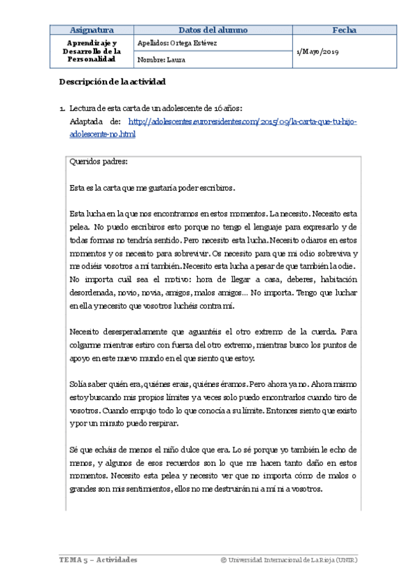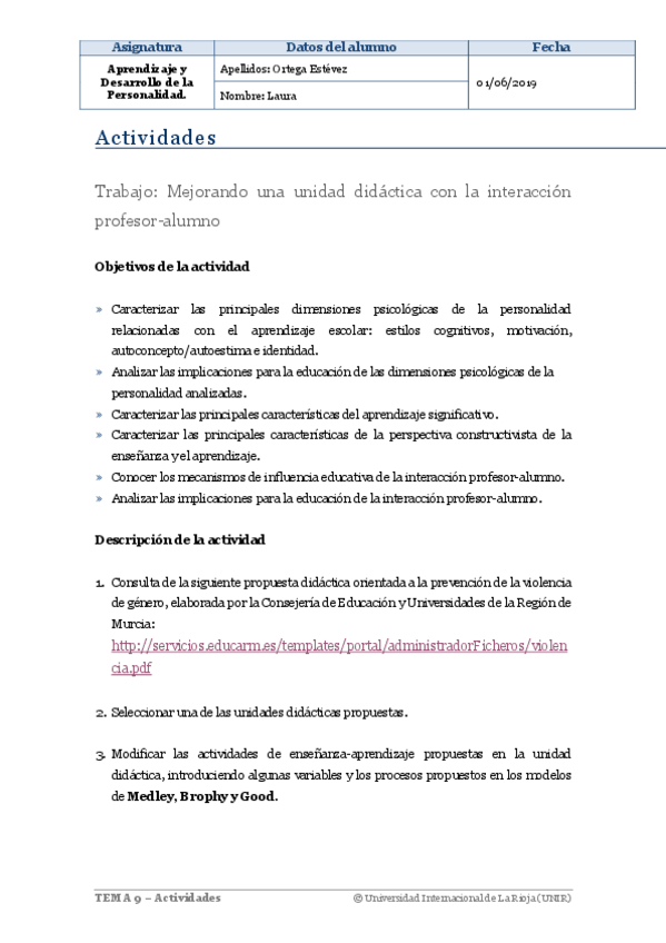 Actividad 1 de Aprendizaje en el Desarrollo de la Personalidad dentro de la especialidad de Biología y Geología. Nota: Sobresaliente