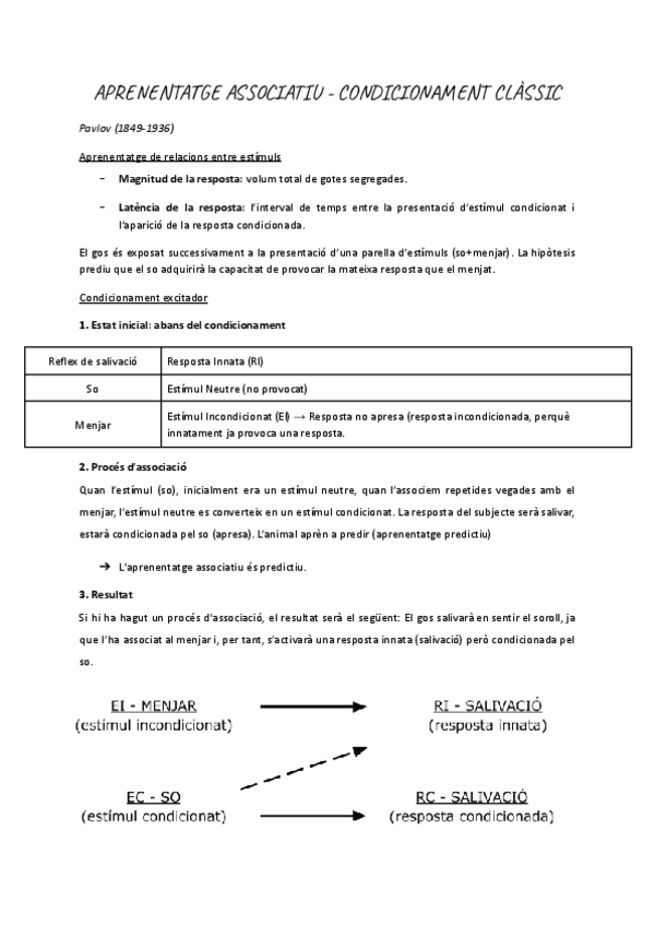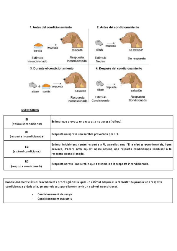 Pavlov, Aprenentatge de relacions entre estímuls, Condicionament excitador (estat inicial, procés d'associació i resultat), Estímul incondicionat, Resposta incondicionada, Estímul condicionat, Resposta condicionada, Condicionament clàssic, mètode de mesur