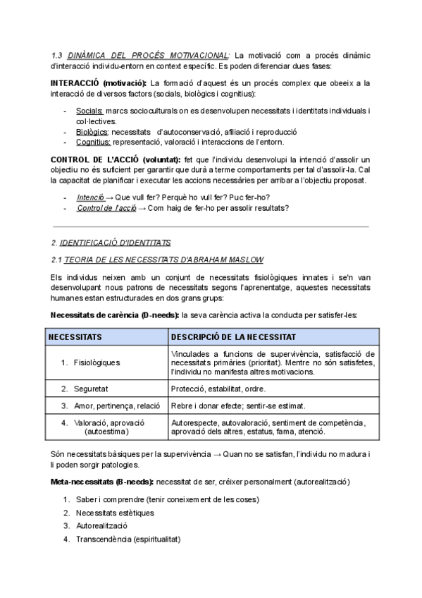 Definició i funcions de la motivació, dinàmica del procés motivacional, identificació d'identitats (teoria de les necessitats, models de Herzberg, model evolucionista de les necessitats, teoria de Maslow revisada a partir del model evolucionista, teoria d