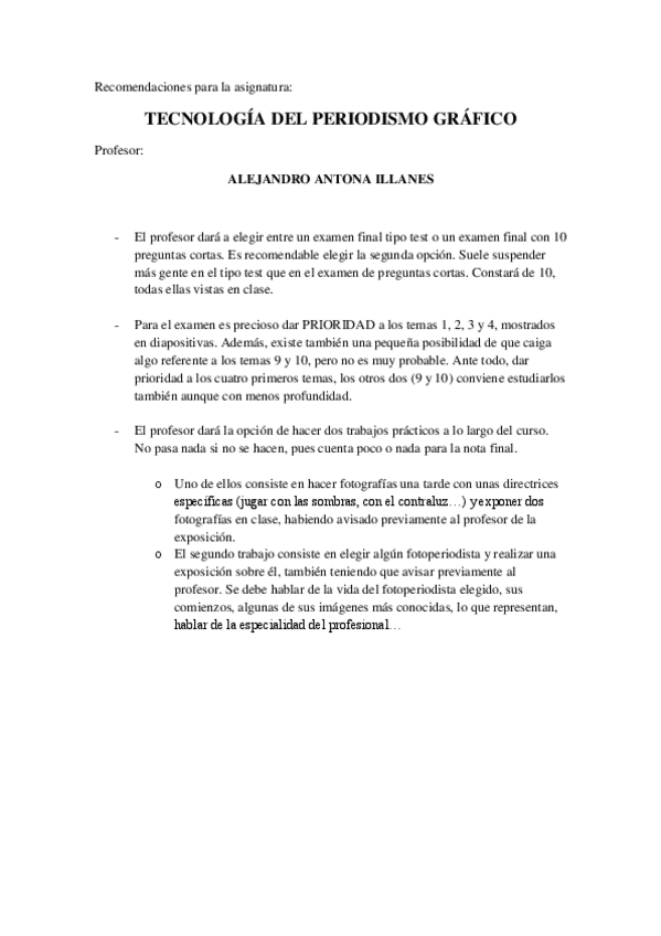 Apuntes completos de la asignatura de periodismo gráfico (fotoperiodismo) válidos con el profesor Alejandro Antona y su examen final.
