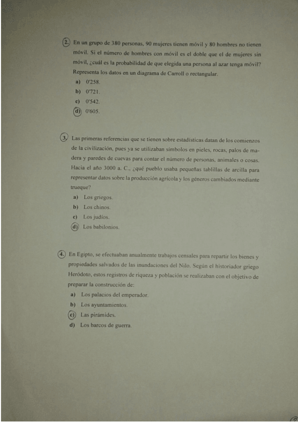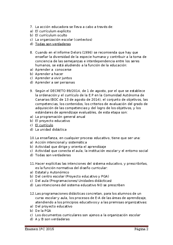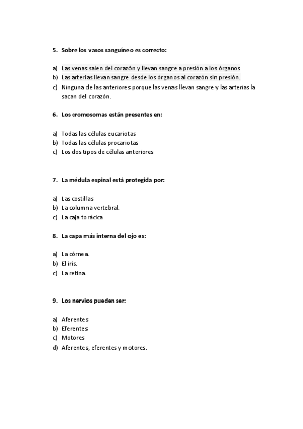 Todas las posibles preguntas que pueden caer son cortas con varias opciones a elegir una, en algunas preguntas aparecen los enunciados con todas las opciones posibles y en otras preguntas solo aparecen los enunciados y la única respuesta correcta.