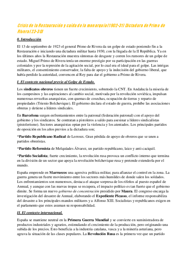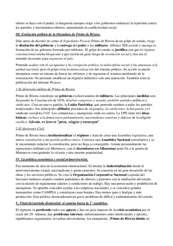 Resume de la asignatura Historia de España de 2º Bachillerato, solo los temas del S. XX y XXI