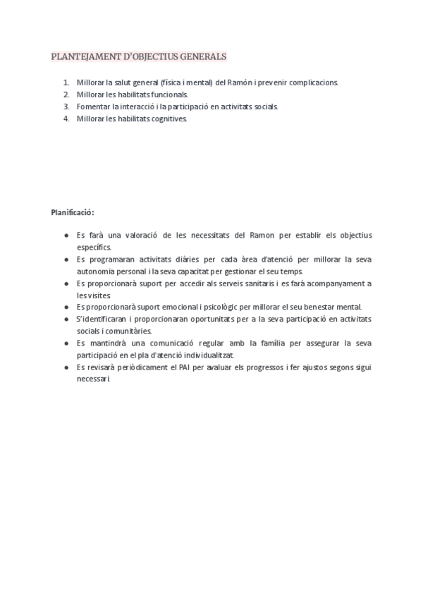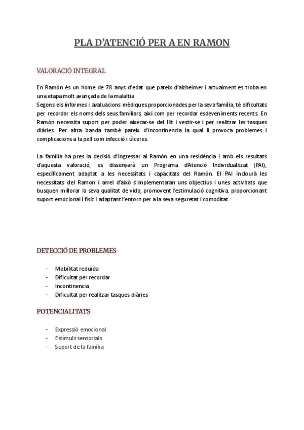 Caso práctico: Plan de atención para Ramón. - Valoración integral - Objetivos generales - Plan de atención individualizado (PAI) - Protocolo de acogida - Protocolo de adaptación - Protocolo en diferentes áreas - Protocolo de higiene - Evaluación final