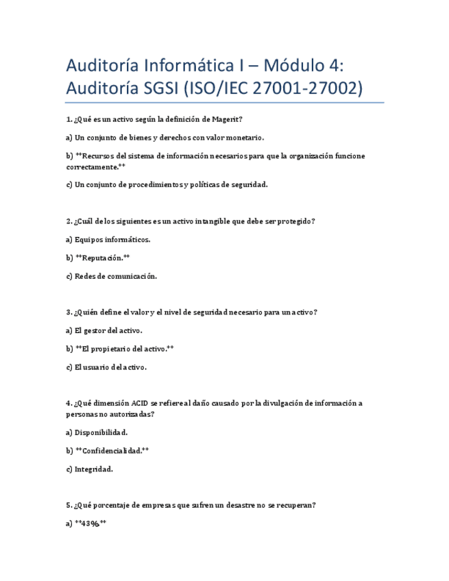 He publicado nuevos test de 4º Auditoria Informática I y II: AI1MOD1cuestiones.pdf