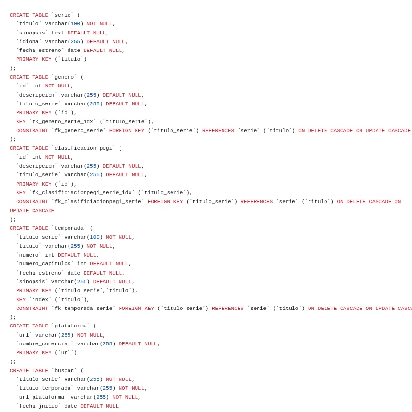Crear las tablas de labase de datos (según esquema indicado) utilizando SQL en el RDBMS (CREATE).