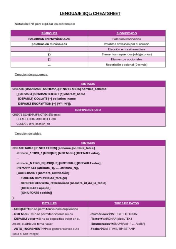 Chuleta de sentencias de SQL COMPLETA. Guía para aprender SQL. Tema 4 y 5 incluidos: Creación de esquemas, tablas, usuarios, inserción de datos, consultas, operadores, funciones agregadas, consultas con más de una tabla, vistas, procedimientos, variables,