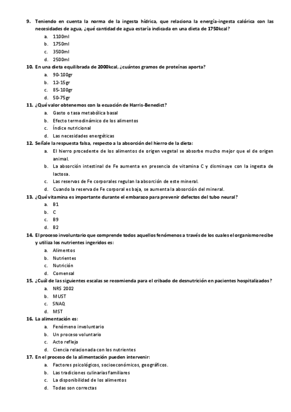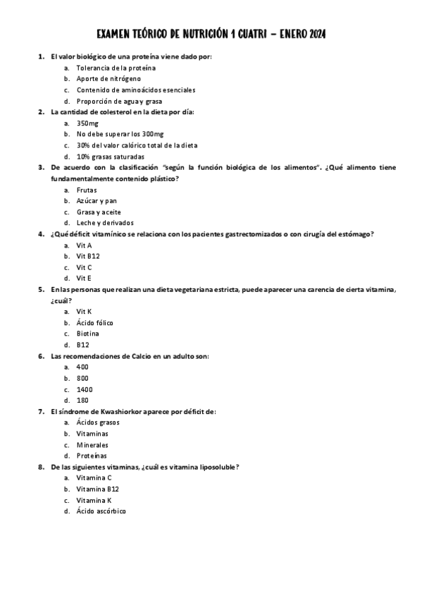 Examen teórico, incluye preguntas de examen de seminario de dietas hospitalarias.