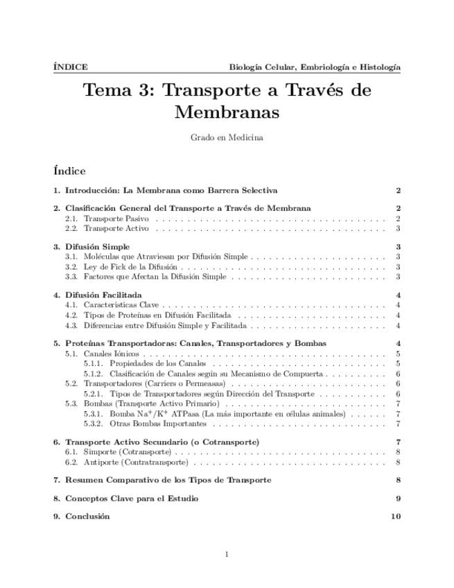 Tema 3. Transporte a través de Membranas. Generalidades y tipos: difusión simple, difusión facilitada y transporte activo. Tipos de proteínas transportadoras: canales, transportadores o permeasas y bombas.