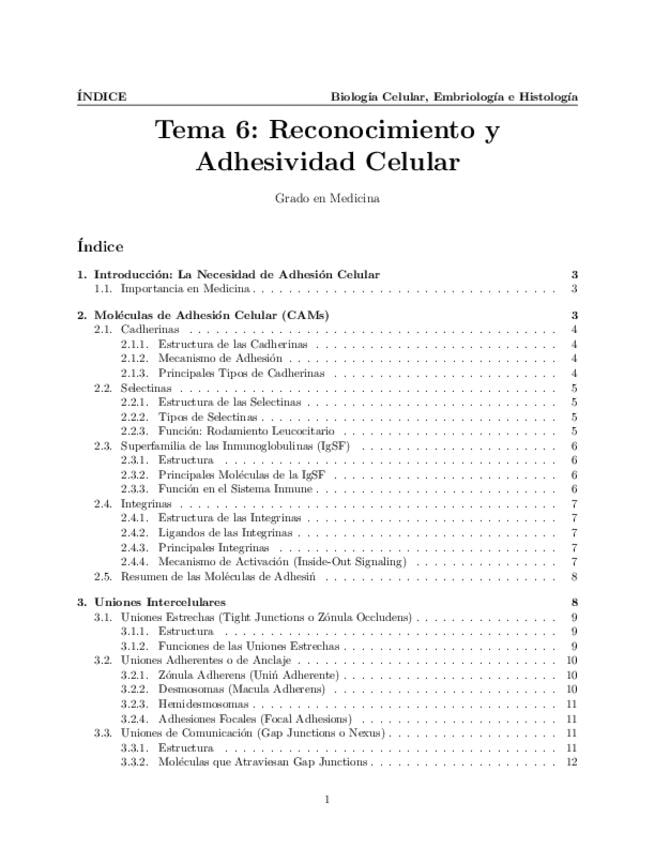 Tema 6. Reconocimiento y Adhesividad Celular. Moléculas de adhesión célula-célula y/o célula-matriz extracelular. Cadherinas. Selectinas. Superfamilia de las inmunoglobulinas. Integrinas. Uniones intercelulares. Generalidades. Clasificación. Uniones estre