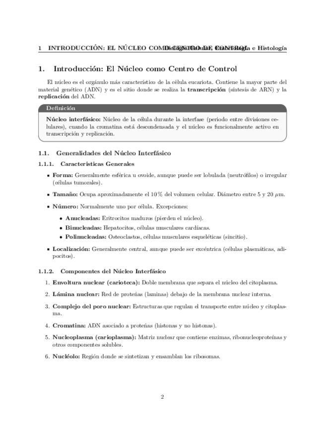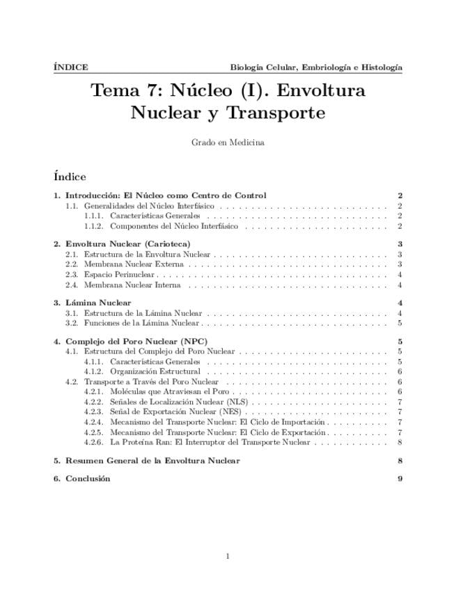 Tema 7. Núcleo (I). Generalidades del núcleo interfásico. Organización de la envoltura nuclear. Membranas nucleares: composición y funciones diferenciales. Lámina nuclear: estructura y función. Complejo del poro: transporte a su través.