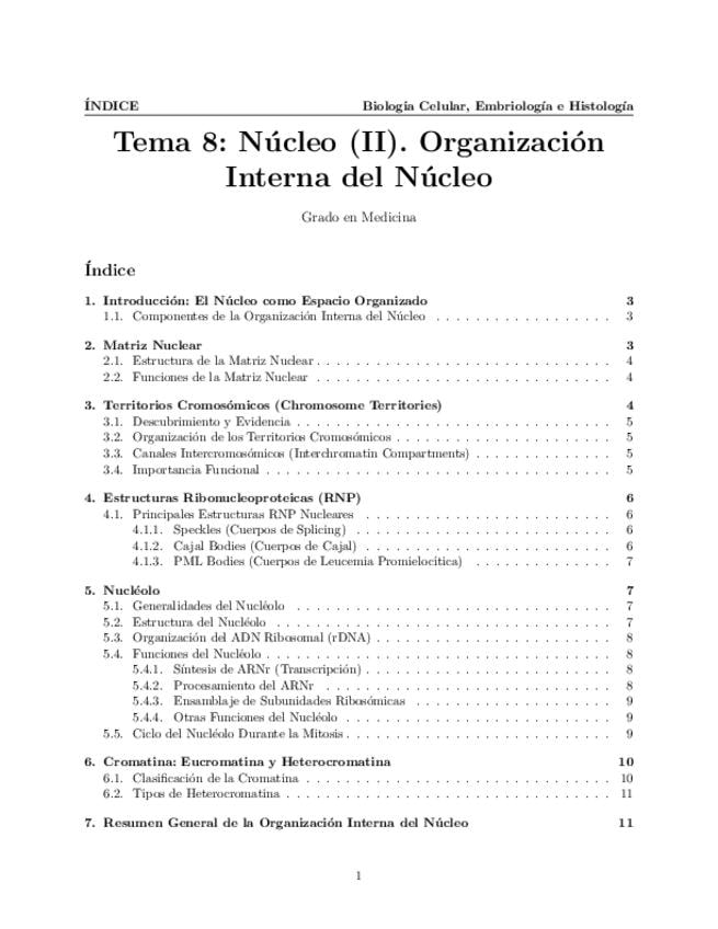 Tema 8. Núcleo (II). Organización Interna del Núcleo. Matriz nuclear. Territorios cromosómicos. Estructuras ribonucleoproteicas. Nucleolo. Estructura. Función.