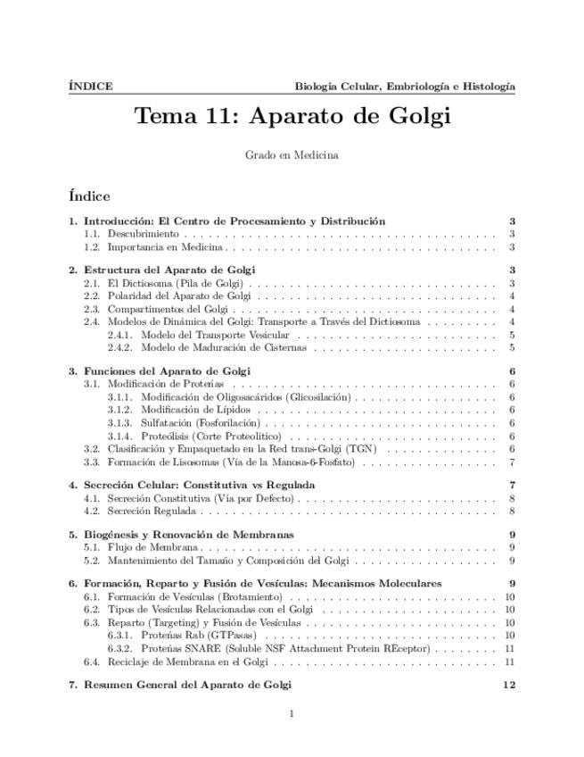 Tema 11. Aparato de Golgi. Estructura del dictiosoma y su dinámica: modelos. Funciones. Secreción regulada y constitutiva. Biogénesis y renovación de membranas. Formación, reparto y fusión de vesículas: mecanismos moleculares.