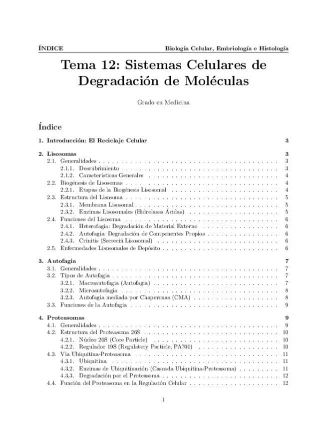 Tema 12. Sistemas Celulares de Degradación de Moléculas. Lisosomas: biogénesis, estructura y función. Tipos de autofagia y función. Proteasomas: estructura. Mecanismos de proteolisis dependiente de proteasomas. Complejo exosoma y degradación de ARNs.