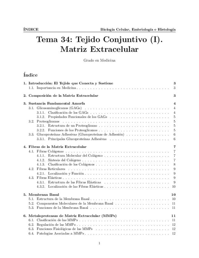 Tema 34. Tejido Conjuntivo (I). Matriz extracelular: características y composición. Sustancia fundamental: glicosaminoglicanos, proteoglicanos y proteínas de adhesión. Fibras de la matriz extracelular: colágenas, reticulares y elásticas. Estructura y func