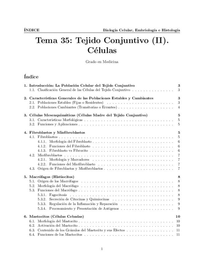 Tema 35. Tejido Conjuntivo (II). Células. Características generales de las poblaciones estables y cambiantes. Células mesenquimáticas, fibroblastos y miofibroblastos, macrófagos y mastocitos: morfología y función. Poblaciones cambiantes del tejido conjunt