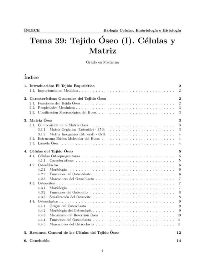 Tema 39. El Tejido Óseo (I). Características generales. Matriz ósea. Composición y estructura básica molecular. Células osteoprogenitoras. Osteoblasto. Osteocito. Osteoclasto. Características celulares, origen y función.